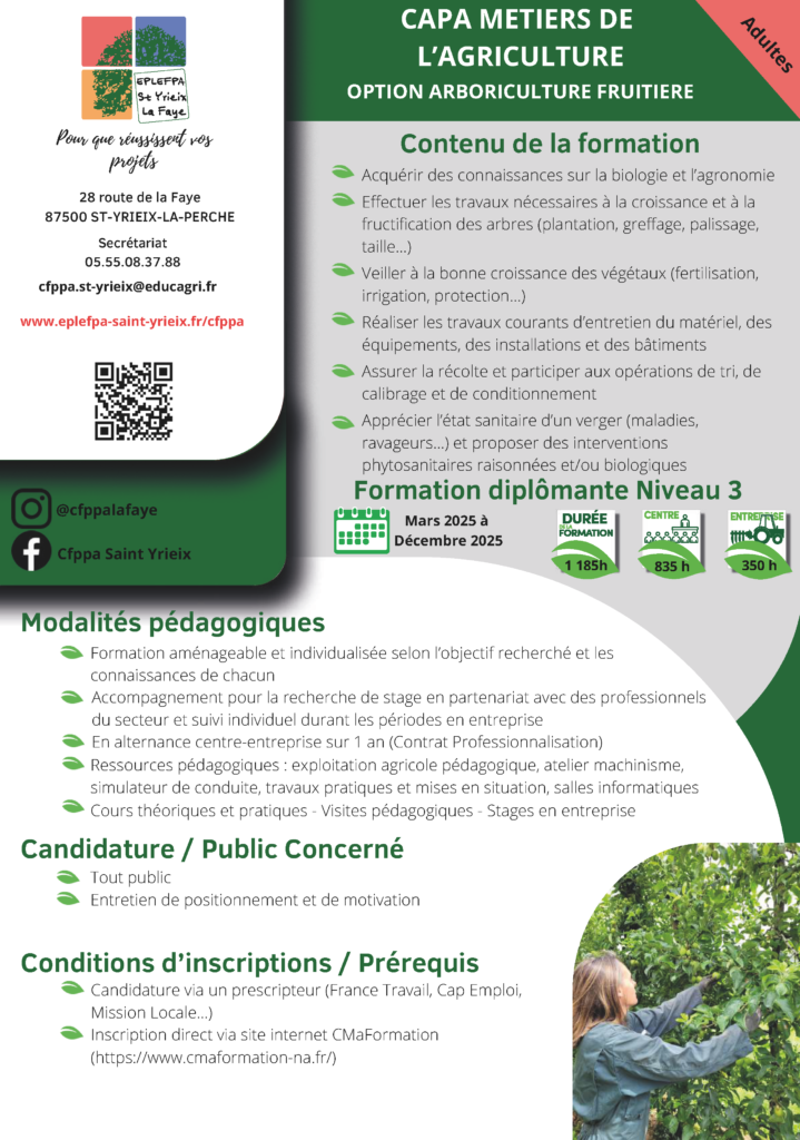 Cette formation est également disponible en apprentissage sur deux ans (option arboriculture et élevage) Plaquette CAPA en apprentissage